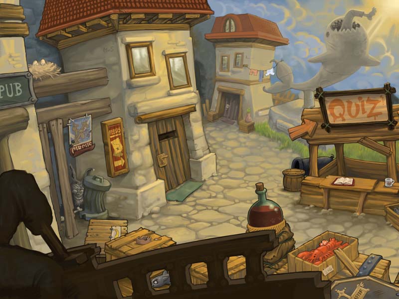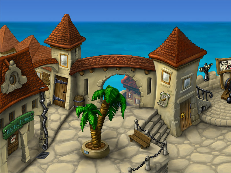 Hier sehen wir einen Teil des Piratennests Pinty Town, das äußerlich eher wenig mit dem Klischee des schmutzig-unangenehmen Freibeuterverstecks zu tun hat. Doch was mag sich hinter den Fassaden der beschaulichen Häuser alles abspielen?